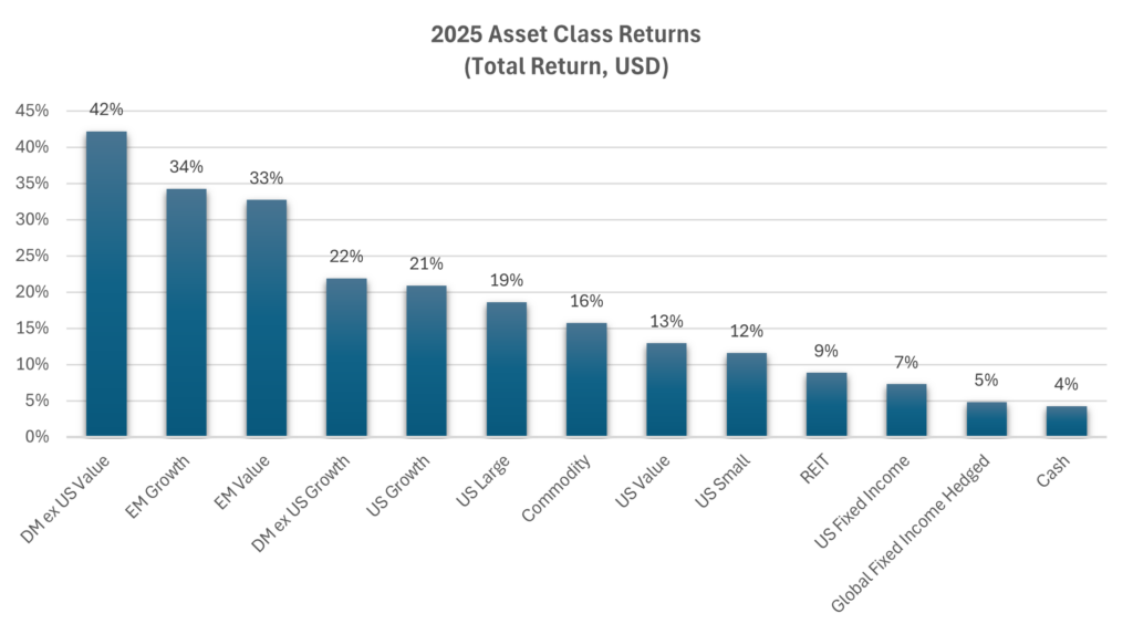 2025 was a standout year by many measures. Despite the steep sell-off in April, global markets delivered exceptional returns. International and emerging market equities dominated the leaderboard with annual returns above 30%, while the S&P 500 posted its third consecutive year of double-digit gains. This reinforces the case for global diversification.