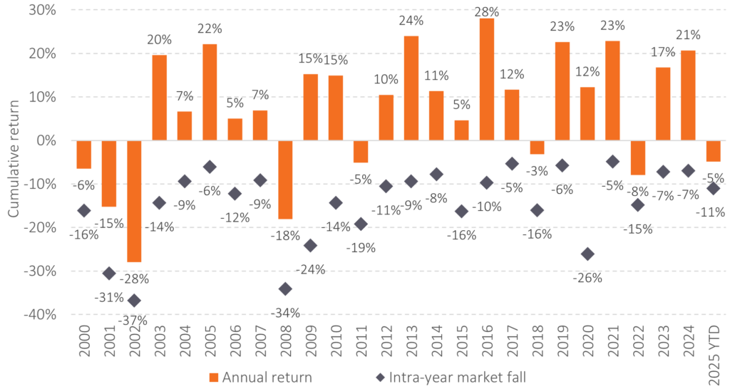 Falls in the value of investments can be curtailed through owning exposure to companies around the world (diversification) and an appropriate amount in high quality bonds, though they cannot be avoided. Making sensible assumptions for the future helps investors retain realistic expectations of investing outcomes and increase the chance of investing success by avoiding bad investor behaviour.