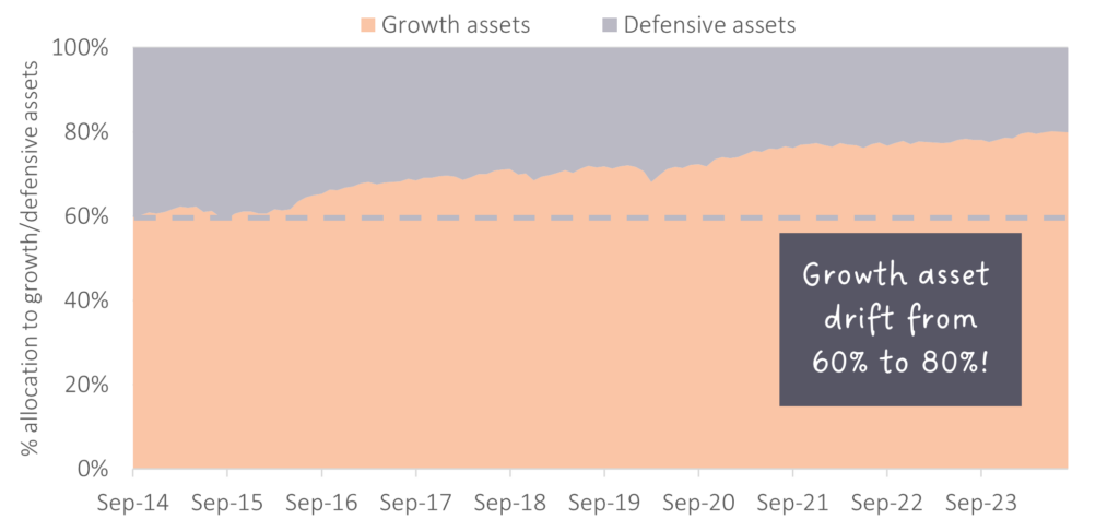 Left unrebalanced, a portfolio comprising 60% global equities (‘growth assets’) and 40% short-dated global bonds (‘defensive assets’) would have drifted to nearly 80% in growth assets over the past 10 years. This is a material change in risk exposure.